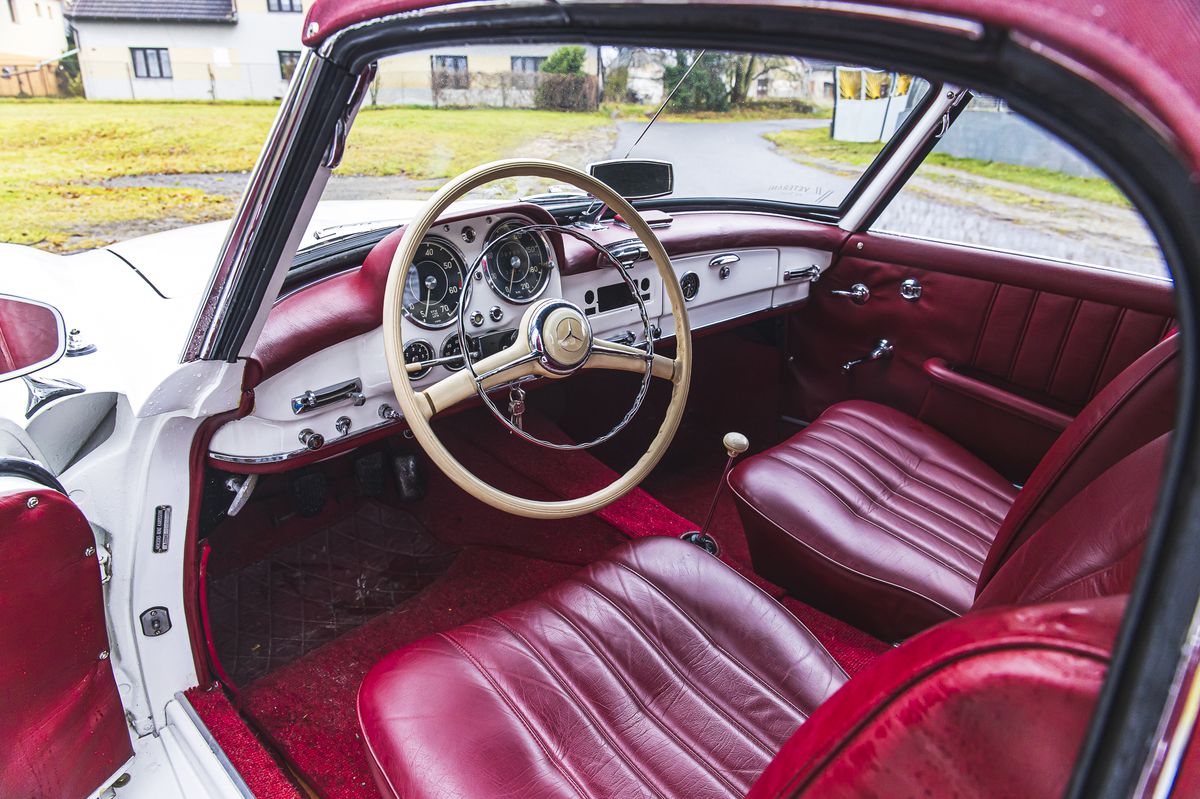 Je 190 SL holčičí auto? Za nás hodně, ale to neznamená, že bych se cítil nějak nepatřičně. Cítím se spíš… Zimně, protože přece nebudu řídit roadster v bundě, to dá rozum. Kompaktní vůz se za pomoci velkého volantu krásně vodí silnicí a je velmi neutrální až přívětivý. Nečekám od něj žádnou zákeřnost a žádná se ani neděje. Jen takový pocit až nečekané noblesy, daný nejen tvary, ale i skutečně krásným interiérem s hezky zdobným přístrojovým štítem. Řazení čtyřstupňové převodovky pomocí dlouhé páky je stejně snadné jako točení volantem. Brzdy jsou dostatečné, s dobrým chodem pedálu i účinností. A motor? Nedosahuje sofistikovanosti větších vstřikovaných šestiválců, ale k účelu auta je zcela adekvátní. S roadsterem se jezdí krásně!