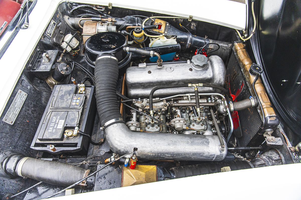 Celá anabáze známá jako 300 SL je samozřejmě spletitější a zajímavější, ale trochu nás odvádí od tématu – asi podobně jako kdybychom začali slintat nad tím nejzajímavějším v podobě závodního 300 SLR (W196), vybaveného řadovým osmiválcem s přímým vstřikováním paliva a desmodromickým rozvodem. Jenže my jsme tu dnes kvůli baby es-lelku, v rámci možností mnohem dostupnějšímu malému bráchovi od plnotučného 300 SL neboli Gullwing, který byl i ve své době pro masy nedostupný. A já navíc před pár lety promarnil příležitost se s gullwingem pořádně projet, což mě do současnosti mrzí. Takže nebudu přeskakovat schody a začnu postupně, od malého čtyřválcového roadsteru pro americký trh.