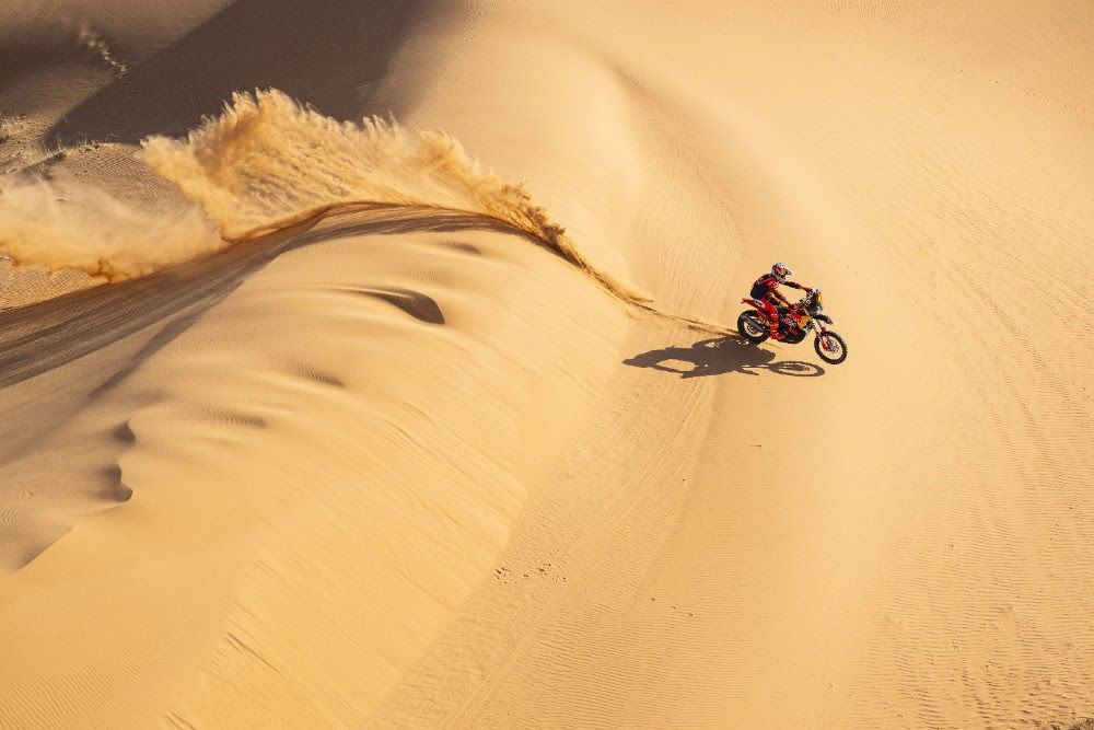 V kategorii motocyklů si průběžné vedení drží Daniel Sanders (KTM), který předvedl mistrovskou jízdu v dunách šesté etapy. Jeho náskok na druhého Rickyho Brabce (Honda) je však jen minimální, pouhých 45 sekund po polovině soutěže, což slibuje napínavý druhý týden. Jedno jméno ale zářilo víc než jiné. Mladičký Španěl Edgar Canet si pro sebe ukradl prolog i první etapu a dlouho bojoval se Sandersem, než si v druhé polovině maratonské etapy zničil zadní pneumatiku. Nejlepším českým jezdcem je Milan Engel, který drží 21. pozici a je taky nejrychlejším jezdcem na stroji Kove.