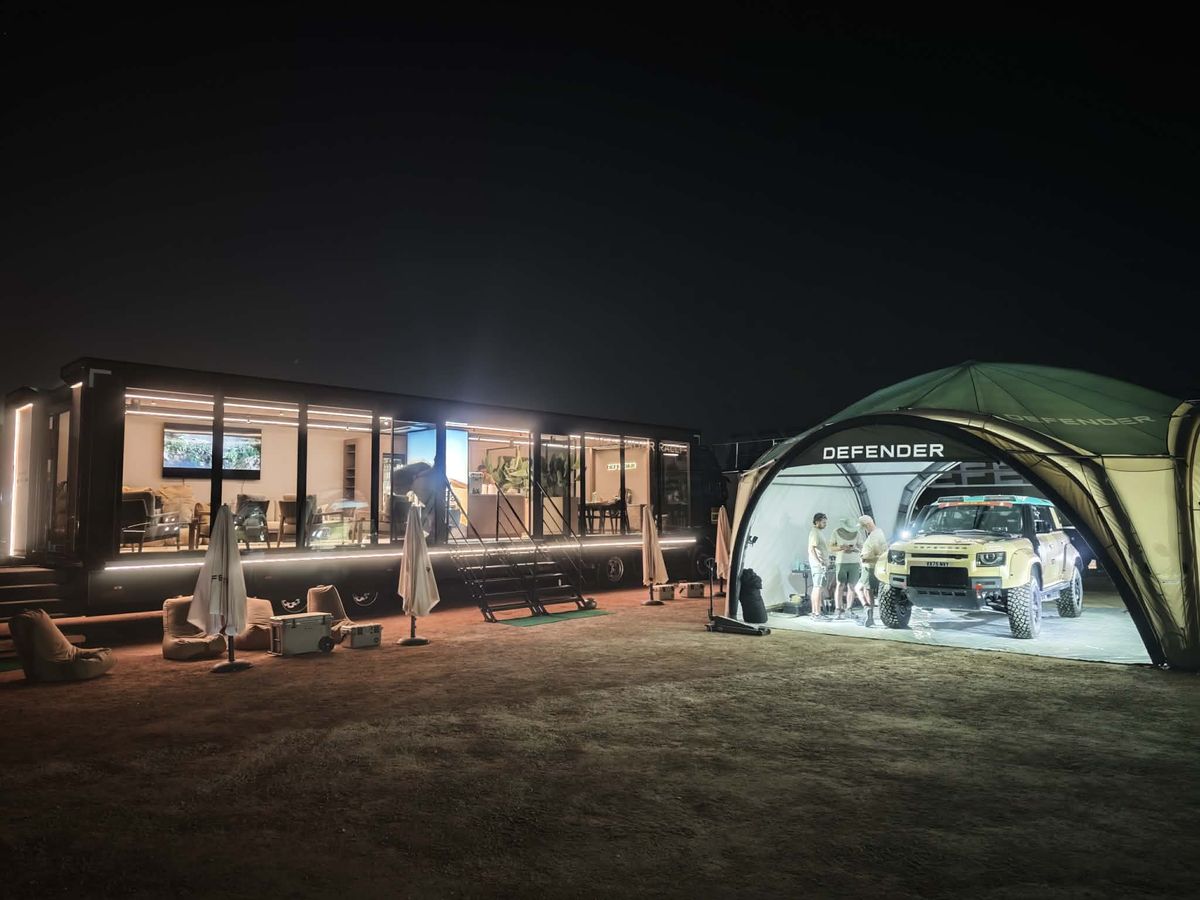 Obzvlášť působivě působí bivak Land Rover když se setmí. Mechanici makají na autech a konferenční místnost hostí návštěvníky.