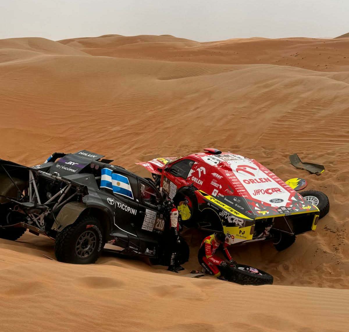 V podstatě se dá říct, že to byla jen otázka času. Kamiony za sebou startují v rozmezí třiceti vteřin a do etapy za sebou odstartoval Vaidotas Žala, Aleš Loprais a Martin Macík v podstatě těsně za sebou, v dalších dvou minutách za nimi byl van den Brink a Martin Šoltys. V dunách se jede ve stopách, které před vámi nechají auta, motocykly a buginy. Desetitunové kolosy vs. motorkáři a obratné stroje třídy SSV. A do toho auta, která den předtím nabrala ztrátu a snaží se prodrat vpřed. Nemůžete moc ubírat, protože jinak dunu nevyjedete (a buď se převrátíte, nebo budete hodinu lopatovat). Ale taky se může stát, že se v ní zahrabete a musíte se otočit, abyste tam nezůstali viset. Všichni vyjmenovaní jsou zkušení jezdci, kteří tohle zažili už mockrát. A všichni vědí, jak nebezpečné to je, když se musíte otočit a v podstatě jet do protisměru. Do toho se ještě často přimotají místní… Ta videa baví a děsí zároveň.