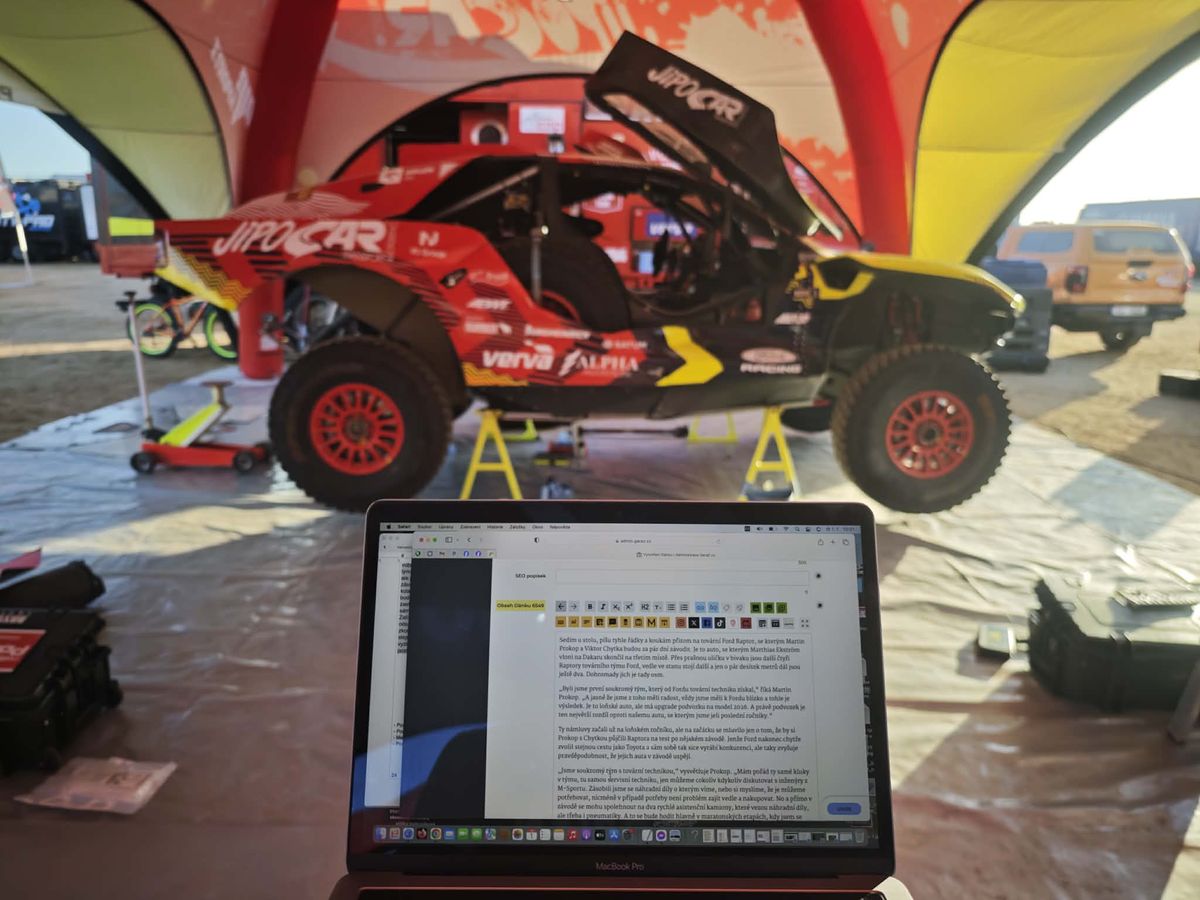 Sedím u stolu, píšu tyhle řádky a koukám přitom na tovární Ford Raptor, s nímž Martin Prokop a Viktor Chytka budou za pár dní závodit. Je to auto, se kterým Mattias Ekström vloni na Dakaru skončil na třetím místě. Přes prašnou uličku v bivaku jsou další čtyři Raptory továrního týmu Ford, vedle ve stanu stojí další a jen o pár desítek metrů dál jsou ještě dva. Dohromady jich je tady osm.