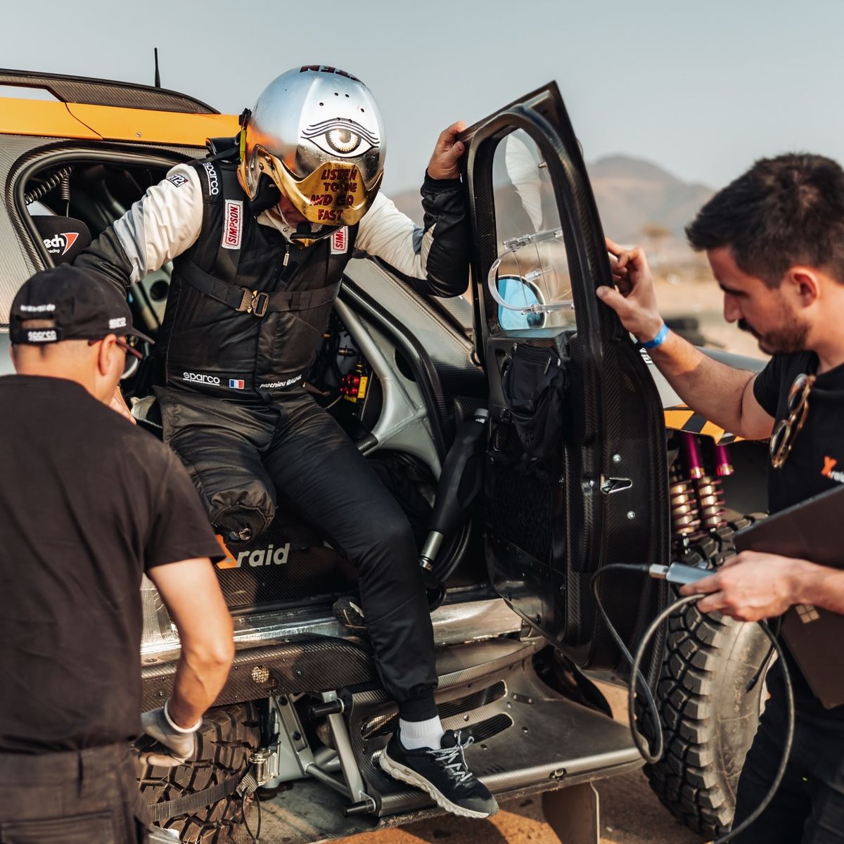 „Během závodu jsem pevně připoután v sedačce pětibodovým pásem, tam nohu nepotřebuji, ale situace, kdy musím já i Guillaum vystoupit z vozidla, jsou úplně jiné,“ vysvětluje. „Defekt pneumatiky se tak může stát skutečnou výzvou, protože s mou protézou je velký rozdíl, jestli je prázdná pneumatika vlevo nebo vpravo.“ Vystupování z auta, zejména v hlubokém písku, od něj vyžaduje obrovskou fyzickou námahu, pak se musí do auta ještě vrátit, práh auta je víc jak metr vysoko…