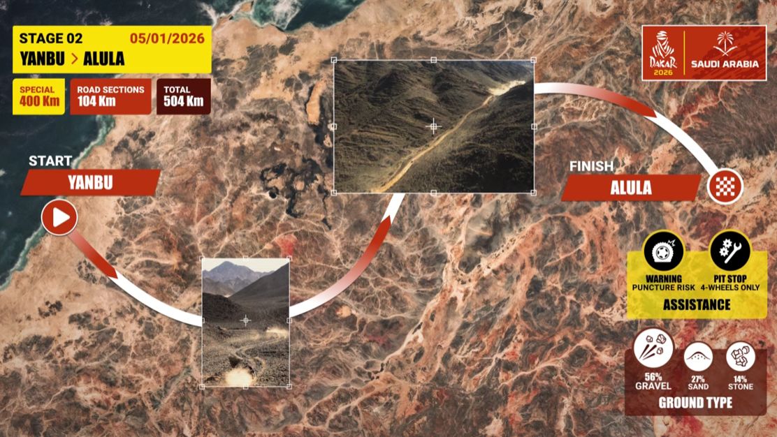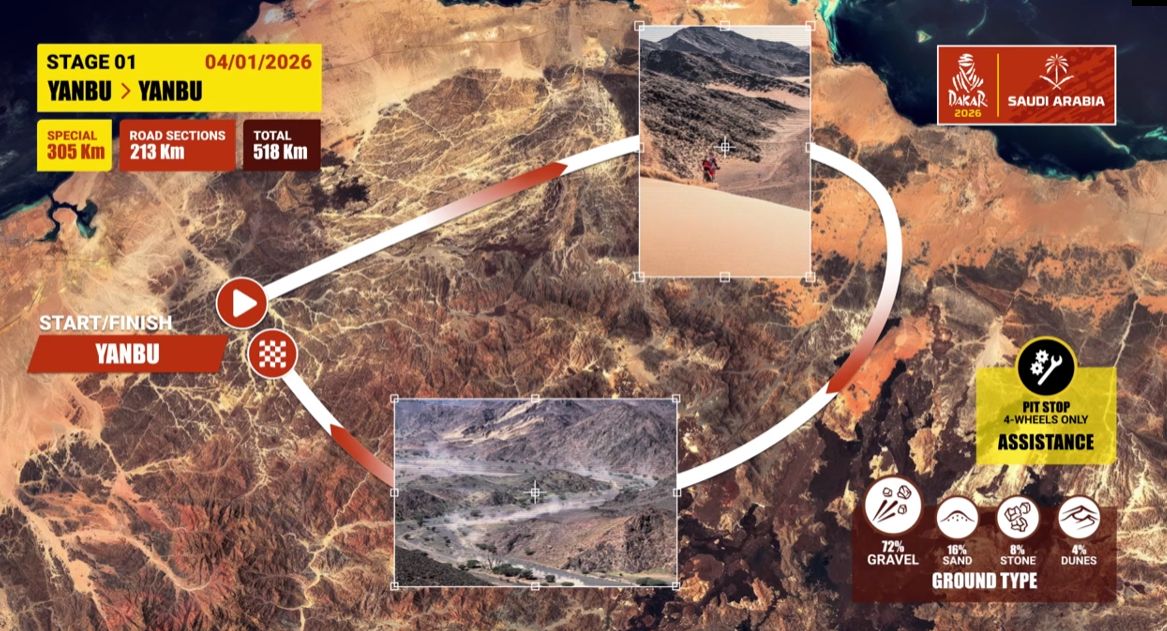 Trať povede velkým okruhem z Yanbu zpět do Yanbu (s volným dnem v Rijádu), protože toto město na břehu Rudého moře má přístav i mezinárodní letiště, což je logisticky pro celou dakarskou karavanu nesmírně výhodné. Odpadnou tak loňské nekonečné přejezdy na start a zpátky z cíle, což všechny jistě potěší. Z logistických důvodů však z programu vypadla i Pustá končina se svými obrovskými dunami – a to už závodníci nevítají tak nadšeně.