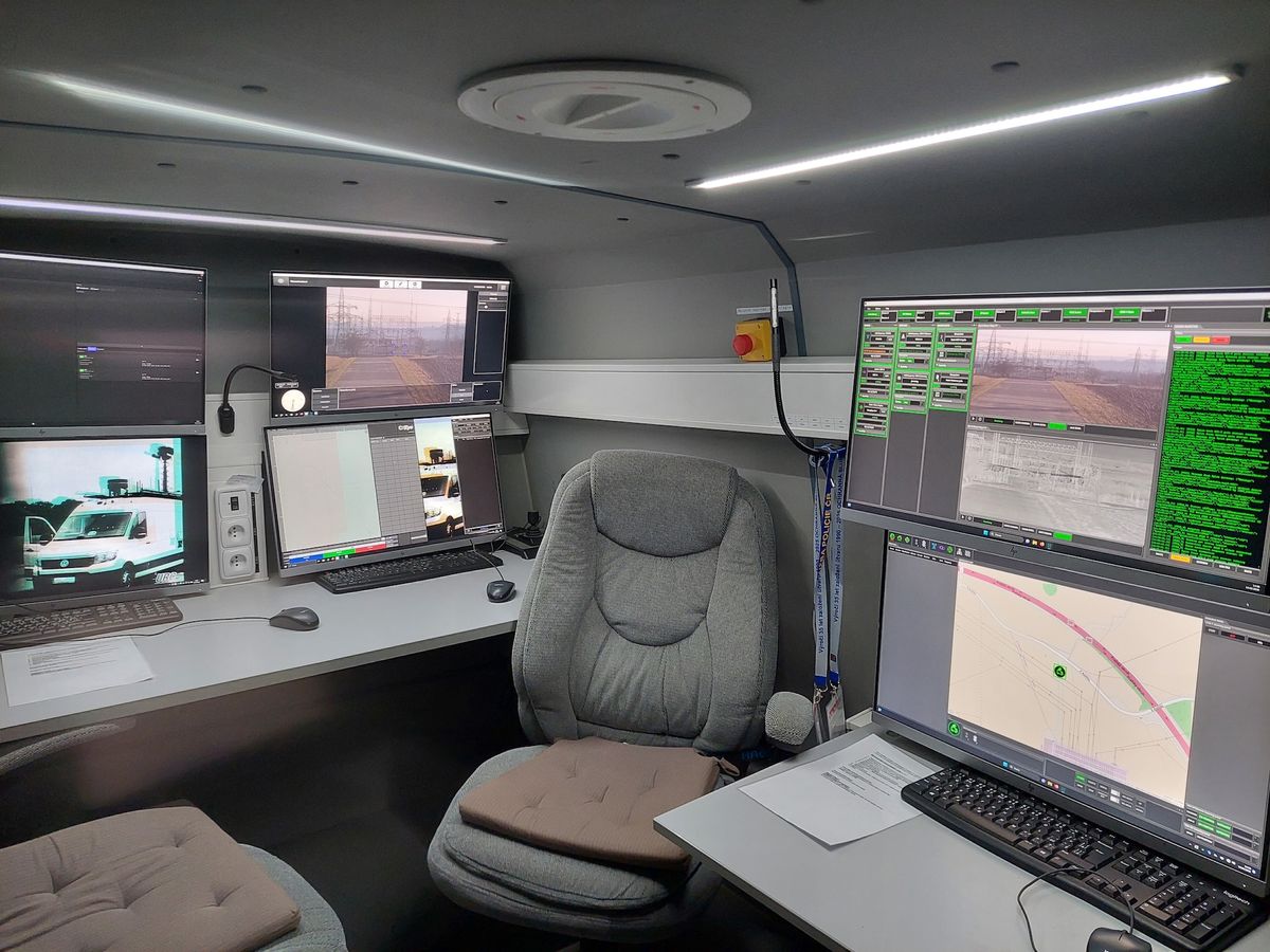 V osvětlené části pro operátory jsou výpočetní, zobrazovací, rozvaděčové a další podpůrné technologie. Zkrátka taková hi-tech operační kancelář. Dále tu je klimatizace a ovládání výsuvného stožáru s antidronovou technologií.