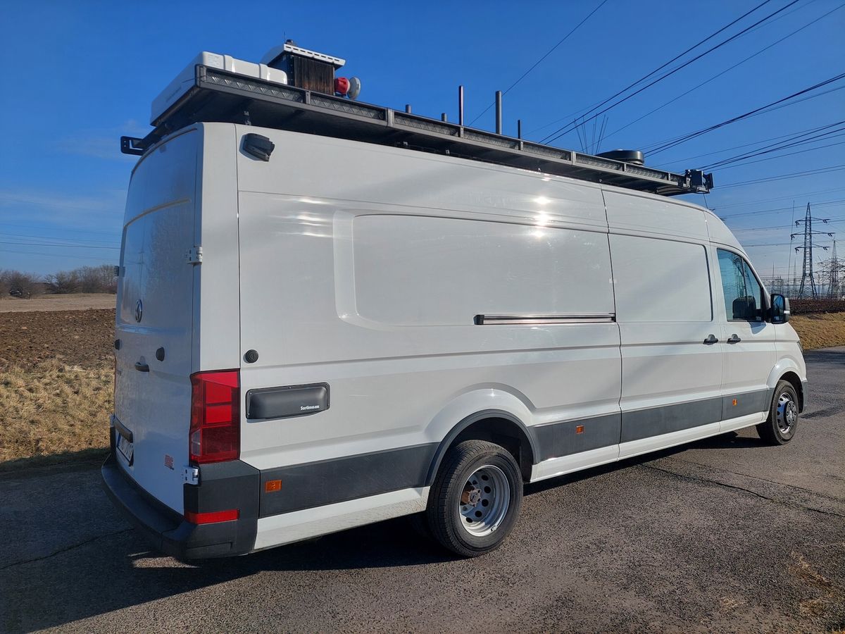 Základ tvoří bílá uzavřená dodávka z roku 2019 s motorem 2.0 TDI o výkonu 90 kW (122 koní) a celkovou hmotností 5 500 kg. Přestože jde o vozidlo zvláštního určení, potřebujete na něj kvůli hmotnosti řidičák nejméně skupiny C1.