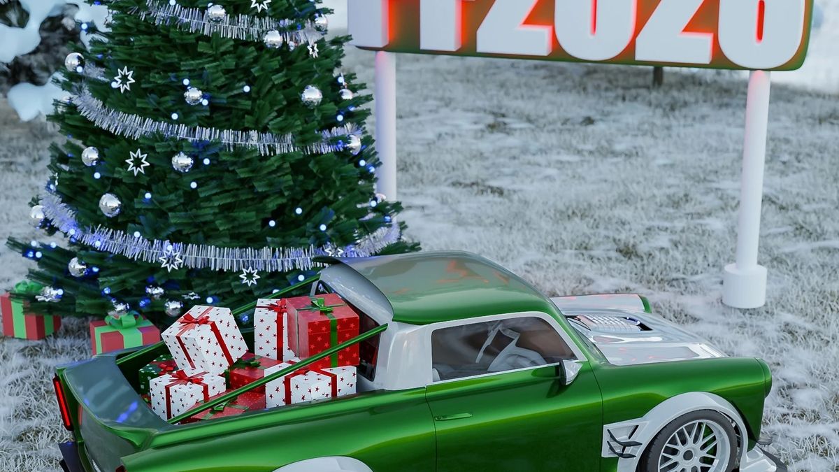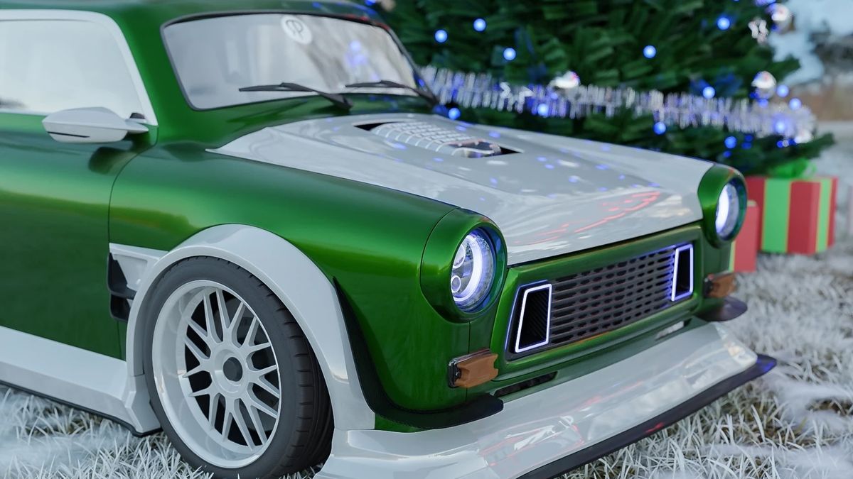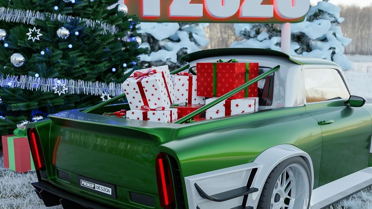 Moderní vertikální diodové lampy svým designem odkazují na originál, celé vozidlo s naloženými dárky na korbě působí hodně surrealisticky.