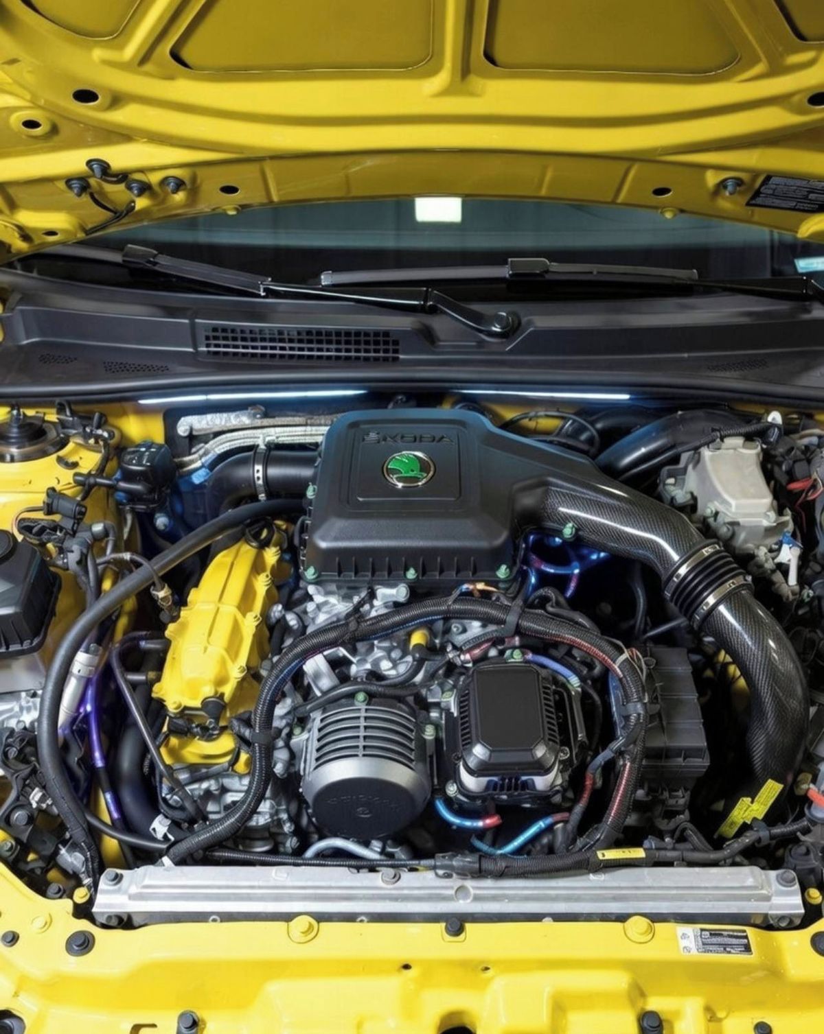 Autor dokonce přidal fotku motoru, který původní škodovácké MPI nepřipomíná ani vzdáleně. Každopádně vidíme sání, vizuálně připomínající karbon, dále elektroniku, chladič, nádobku.