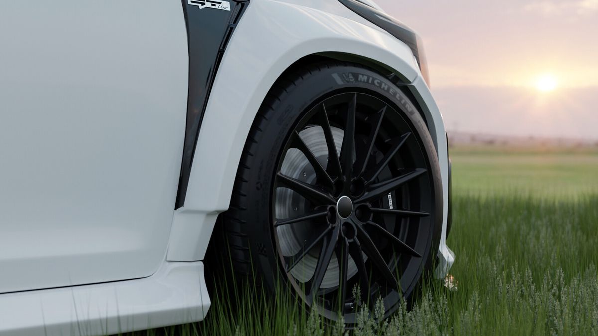 Lehká kovaná kola vozu jsou obutá na pneumatikách Michelin, za nimi mají své místo velké brzdové kotouče, na černě lakované střeše najdete anténu ve tvaru žraločí ploutve.