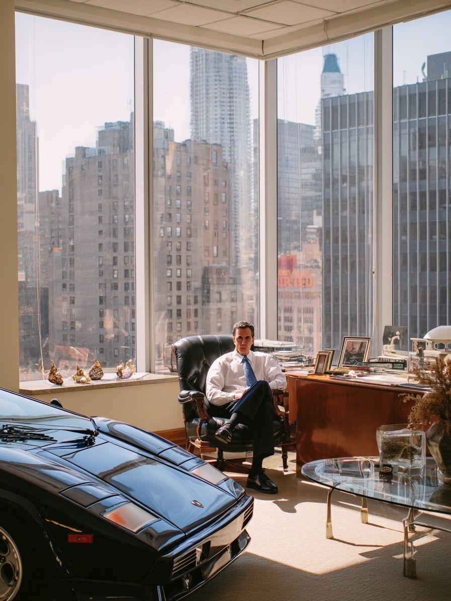 „Tito muži byli součástí kultury založené na úspěchu a viditelnosti. V té době newyorské finance vzkvétaly a konkurence byla vysoká. Mít supersport neznamenalo jen užívat si rychlost. Šlo o vyslání jasného signálu. Umístěním auta do interiéru zajistili, že bude neustále na očích. Klienti i návštěvníci okamžitě pochopili úroveň bohatství a moci v místnosti. V tomto rozhodnutí byl také prvek kontroly. Auto venku může být skryté nebo přehlédnuté, ale uvnitř se stává součástí každodenního života. Odráží identitu i ambice. Pro některé to byla odměna za dlouhé hodiny práce a náročné obchody. Pro jiné symbol toho, že uspěli ve světě, kde status hrál zásadní roli,“ pokračuje popisek.