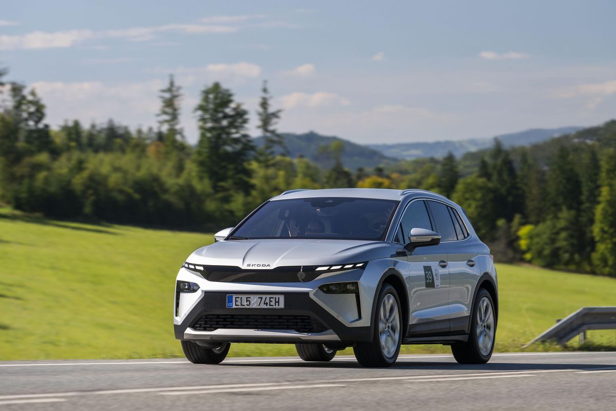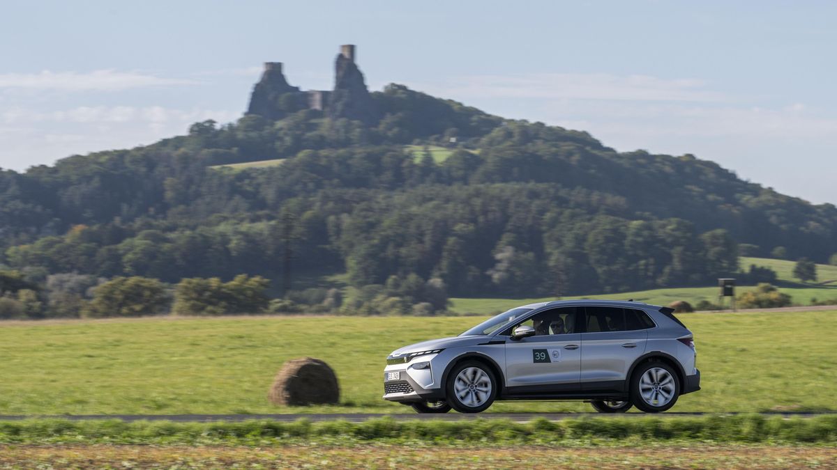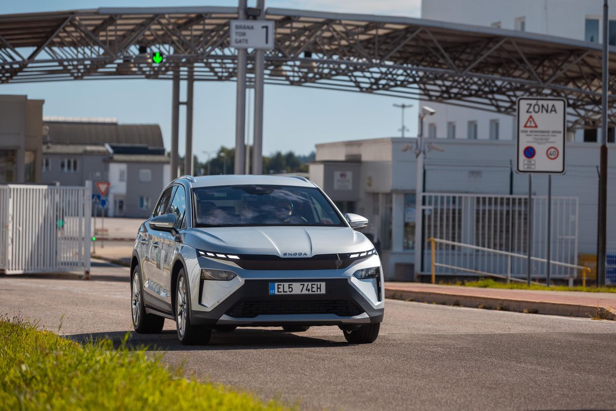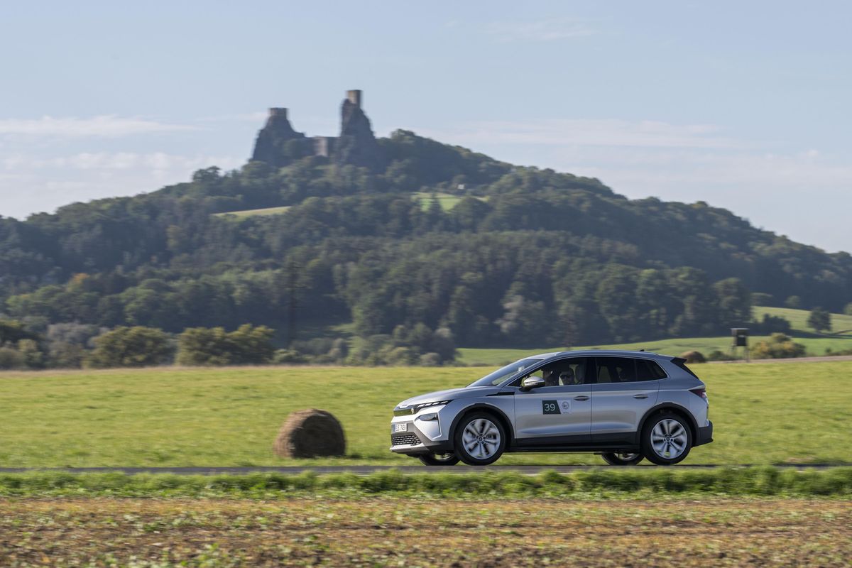 Vidíte, ještě něco málo k závodnímu stroji. Nastoupili jsme se Škodou Elroq 85 Selection, což znamená zadní poháněnou nápravu, elektromotor o výkonu 210 kW, baterku s kapacitou 82 kWh, normovanou spotřebou 15,2 až 16,4 kWh a dojezd až 573 km. Předběhnu a prozradím, že jsme se dostali hluboko, přehluboko pod Škodovkou udávanou spotřebu v kombinaci.