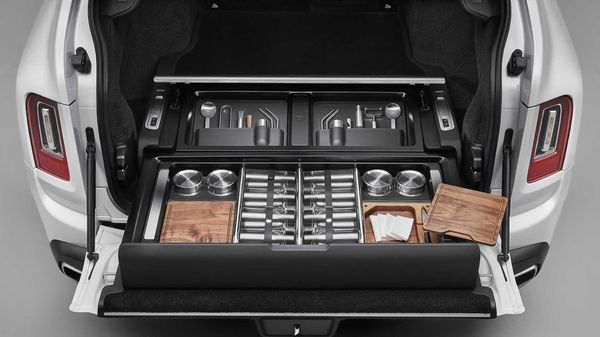 Spodní část děleného zadního víka Rolls-Royce Cullinan skrývá tajemnou zásuvku o objemu 48 litrů. Jak už je u Rolls-Royce zvykem, můžete si ji, jako spoustu ostatního, specifikovat na míru. Třeba tam můžete mít kompletní piknikový set. Ale stejně dobře by tam mohly být pečlivě uložené zbraně nebo třeba kolečkové brusle.